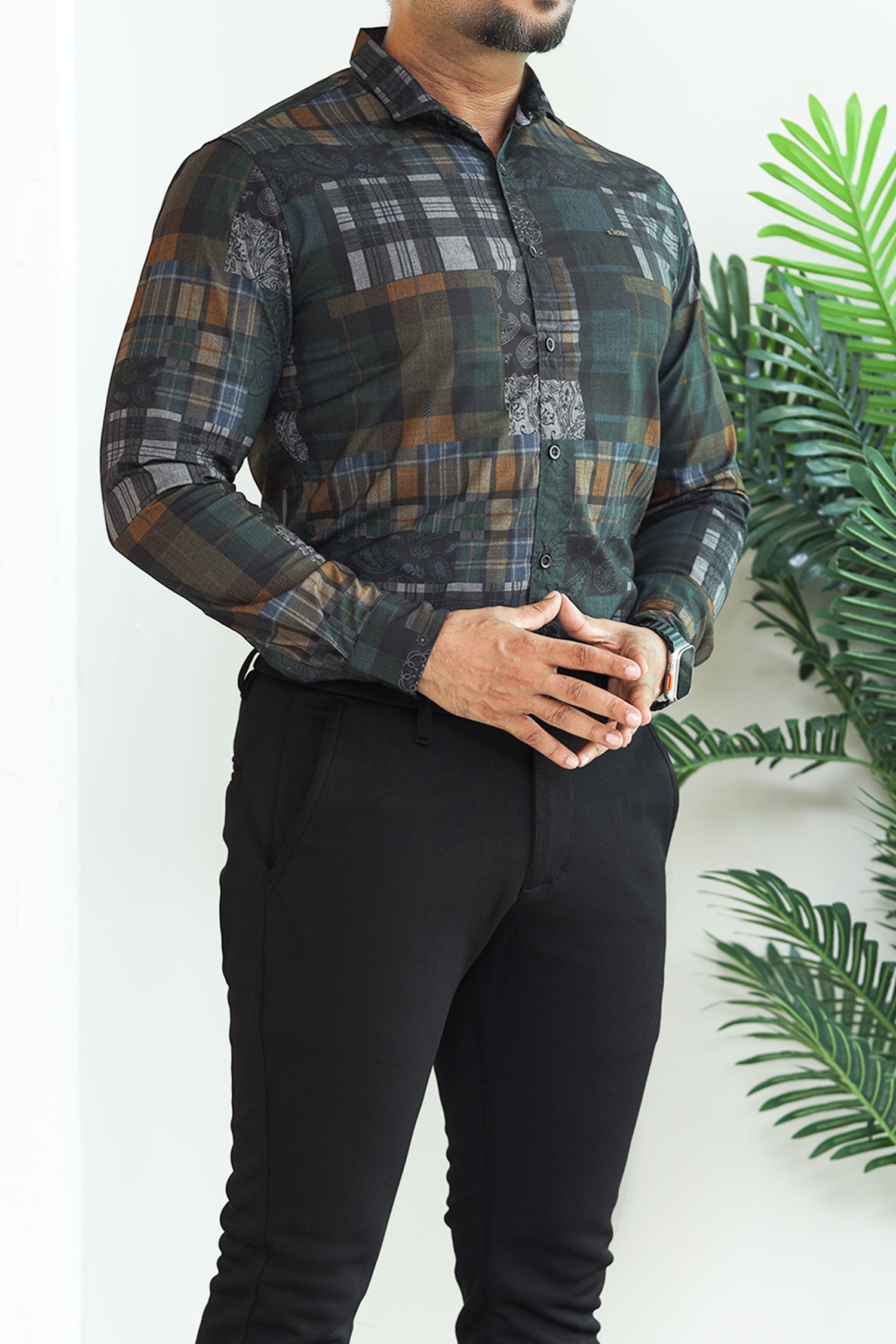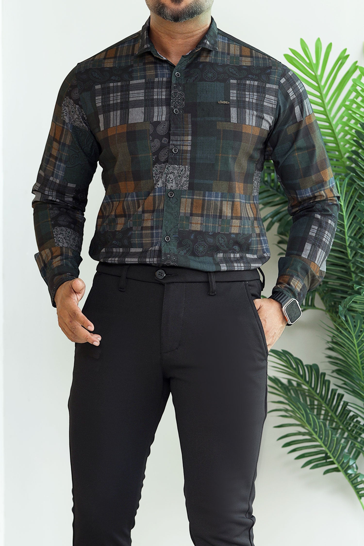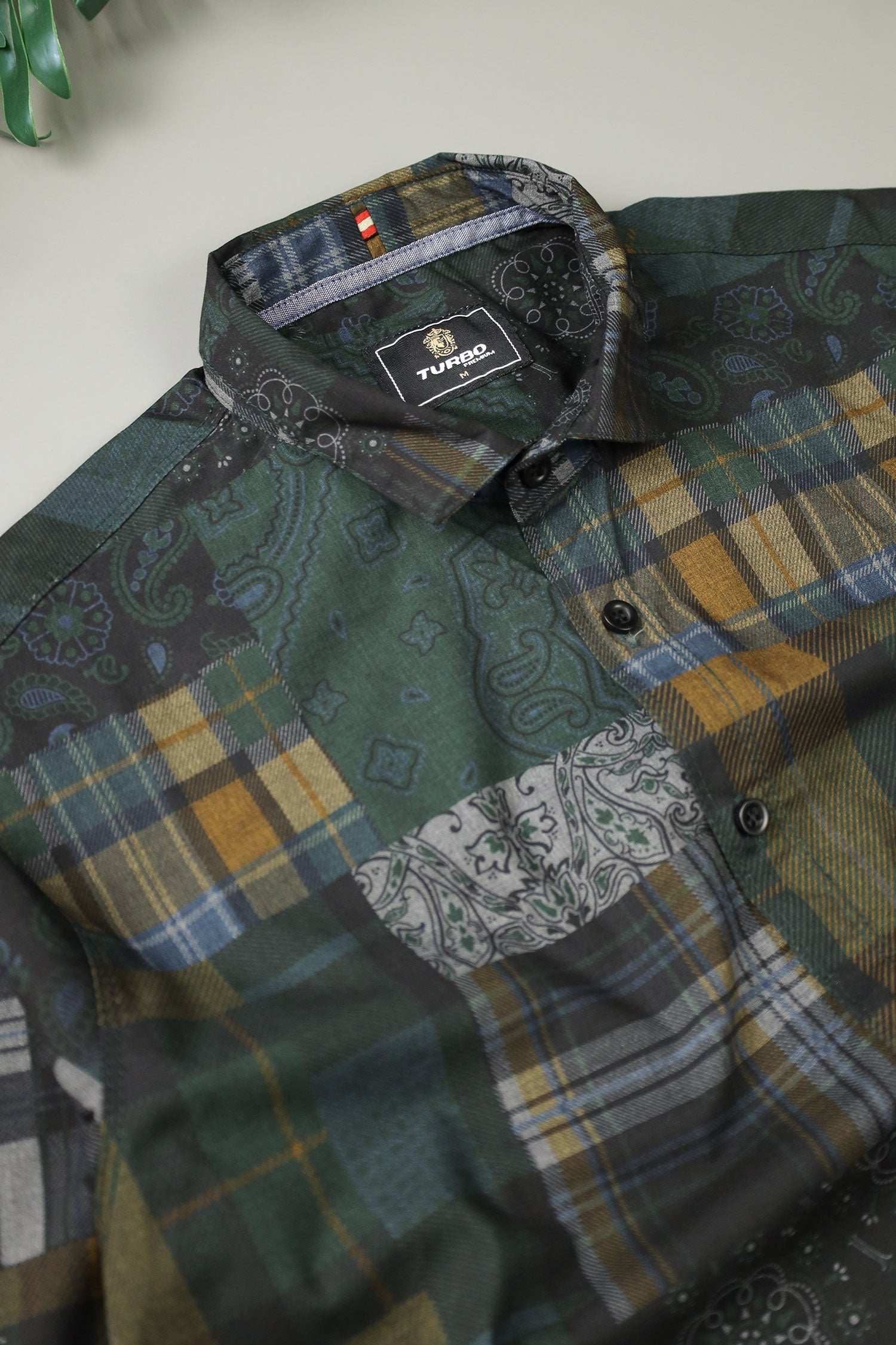Turbo Checkered Crown Long Sleeve Cotton Casual Shirt In Dark Green