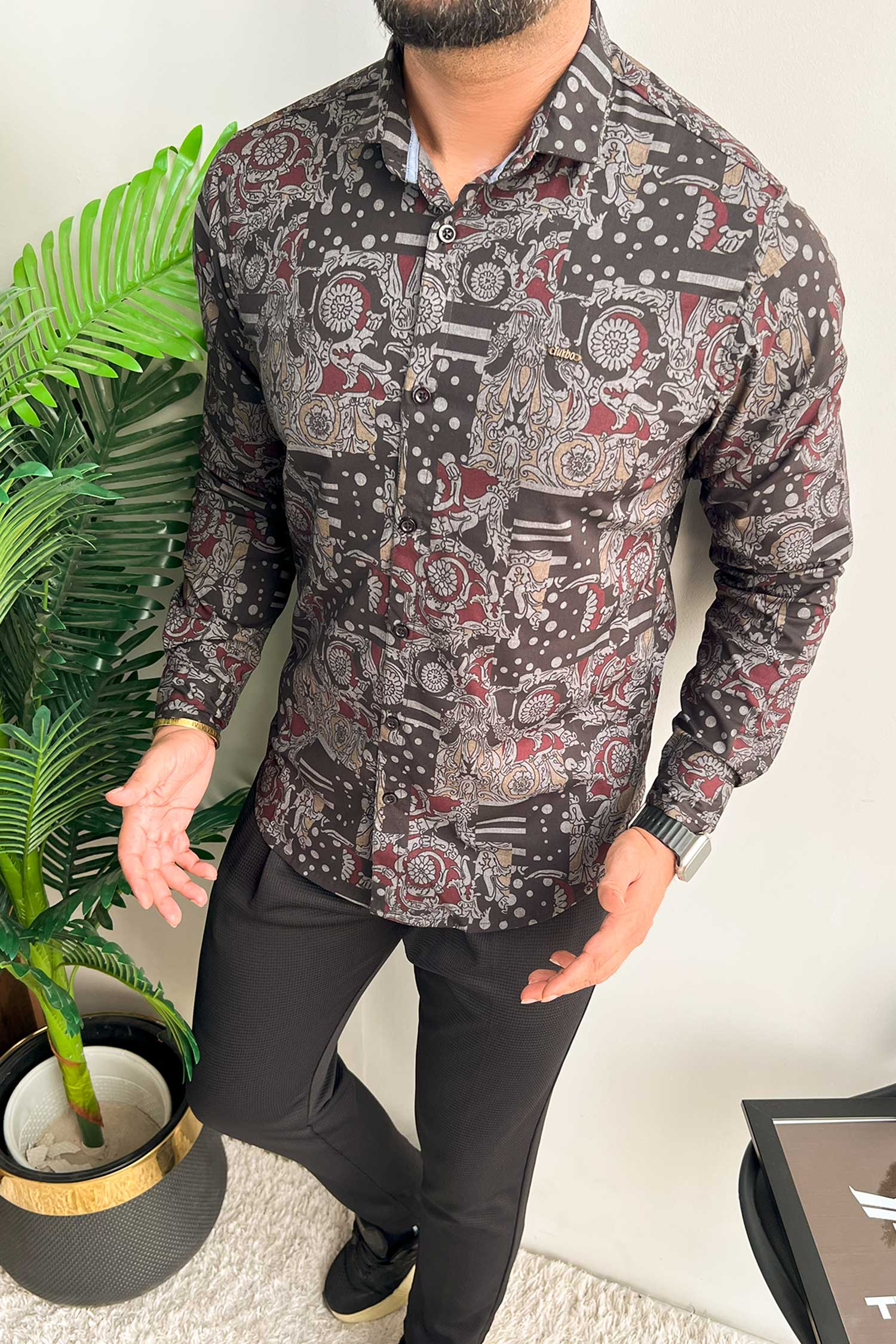 Turbo Retro Flower Motif Long Sleeve Cotton Casual Shirt In Black