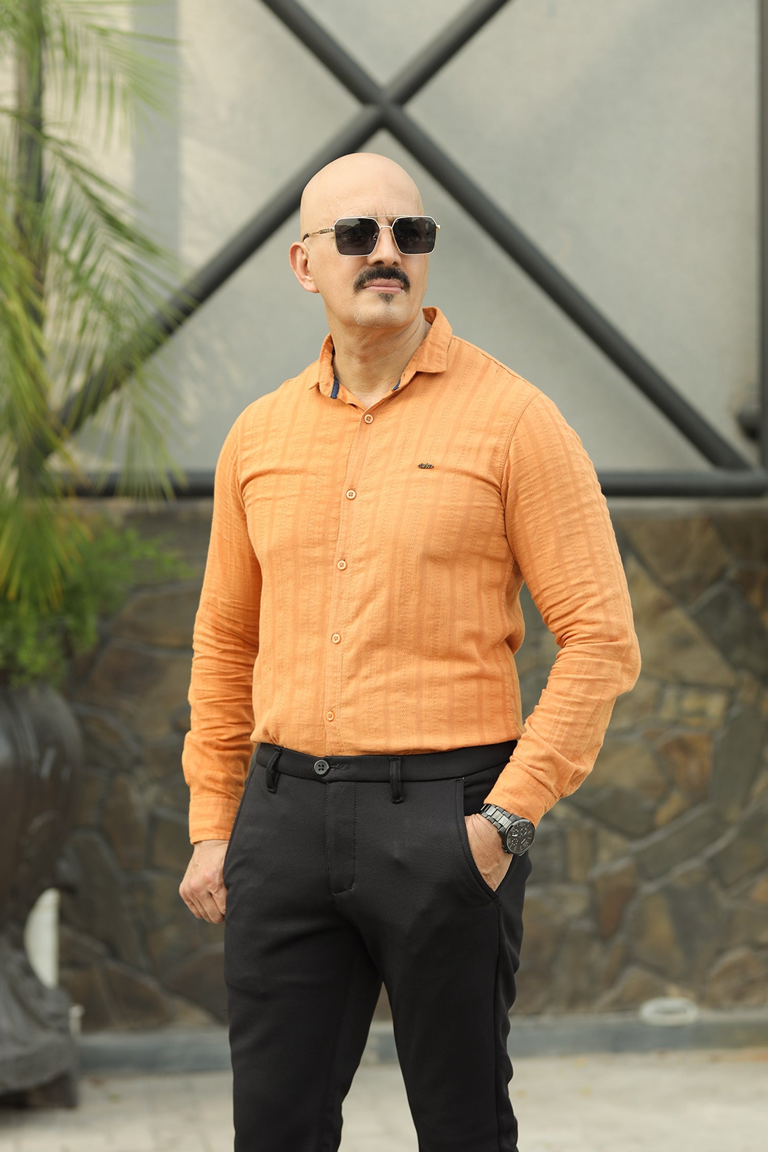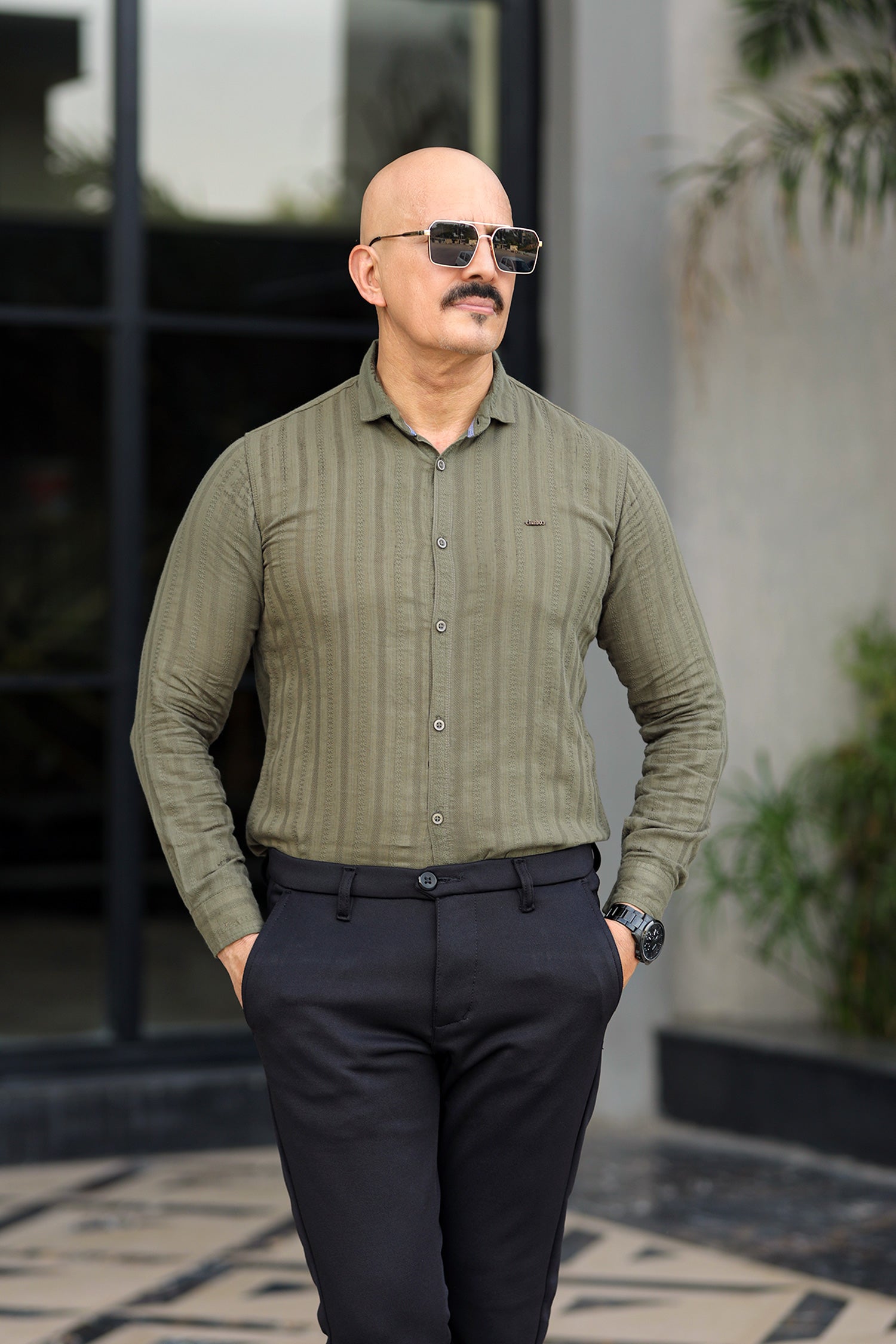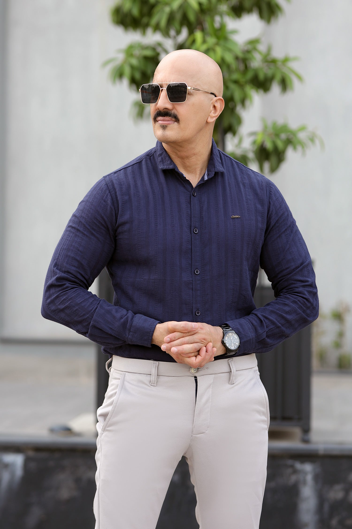 Turbo Self Stripe Motif Long Sleeve Cotton Casual Shirt